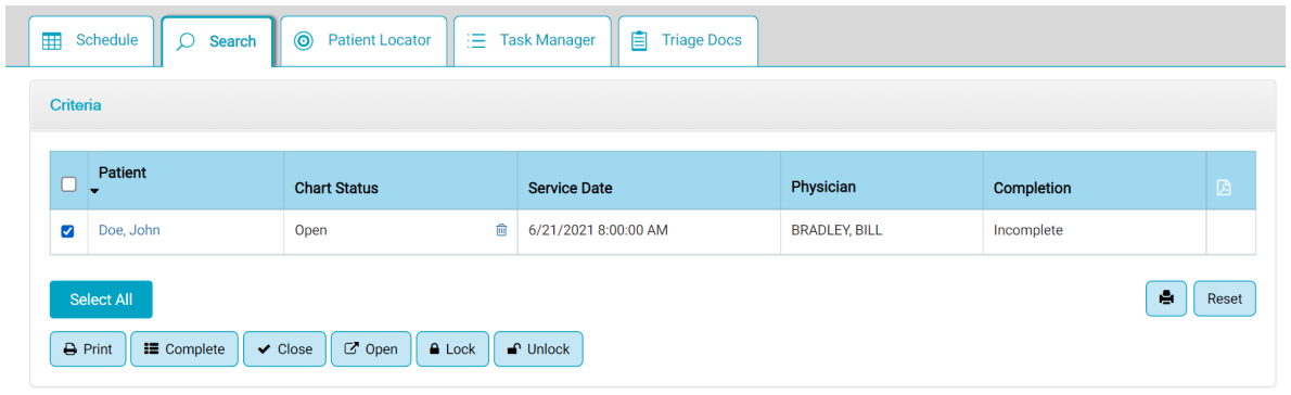 The search results appear in a grid. Results can be sorted by tapping on the individual column headers, i.e. Patient, Chart Status, etc.