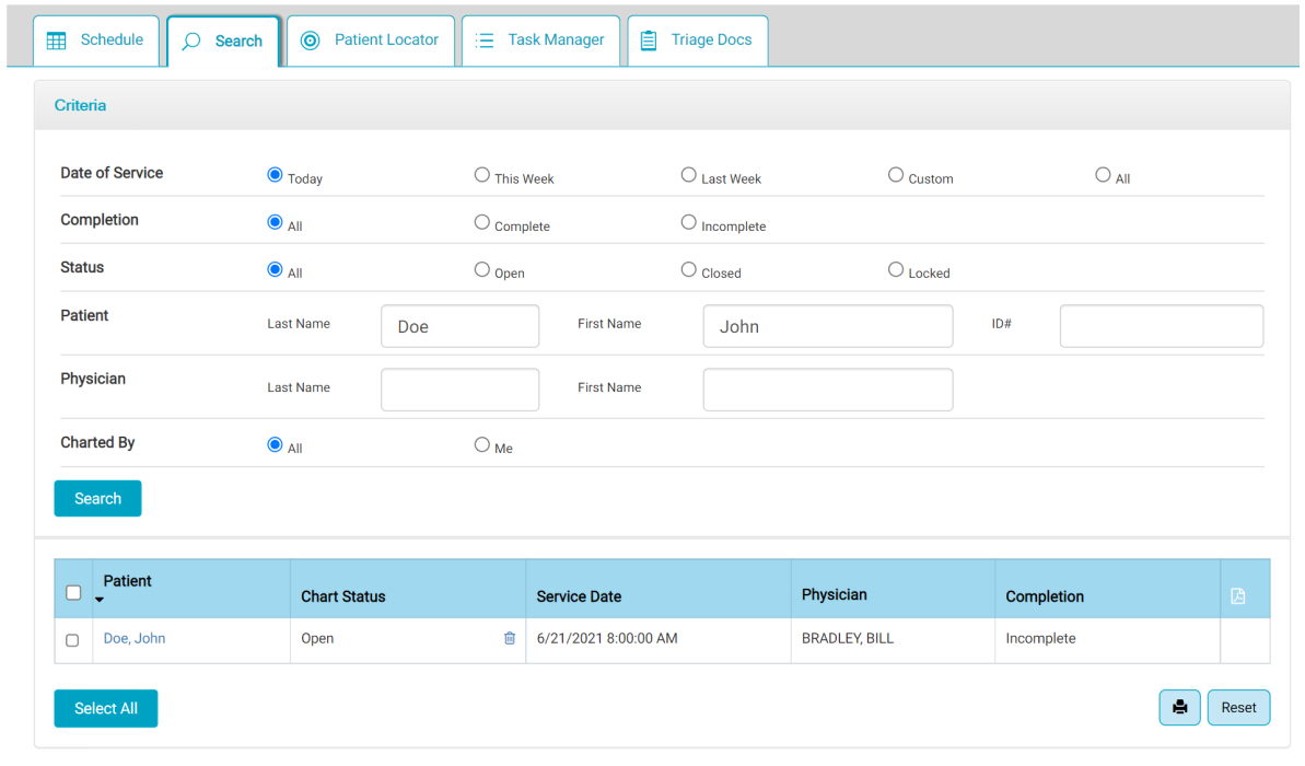The Search Tab is one of the main tabs in HST eChart, located to the right of the Schedule Tab. It can be used to locate charts and perform certain actions, such as closing and printing charts.