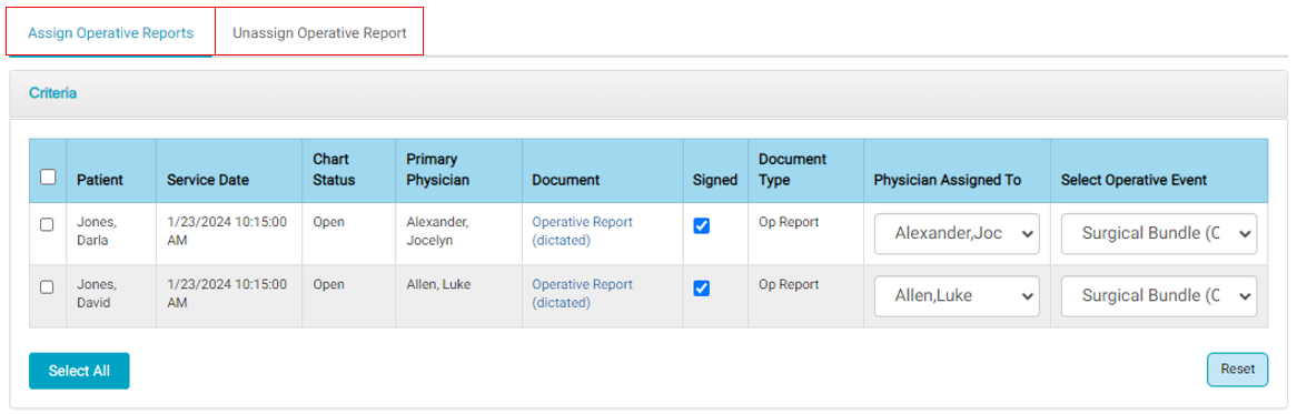 The Unassign Operative Reports function is used when an operative report has been incorrectly attached to a chart - either incorrectly marked as signed or unsigned or assigned to the incorrect physician or bundle. After an operative report has been unassigned, it can reassigned using the Assign Operative Reports function.