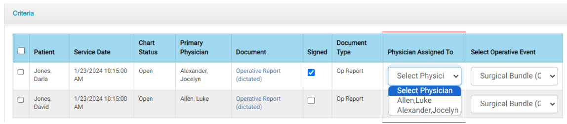 The Triage Docs tab is used to attach operative reports to a chart and assign or unassign operative reports to physicians and bundles.