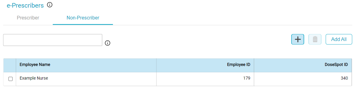 This grid in this tab lists the employees which have a DoseSpot ID associated with their Employee ID. The grid has columns which display the employee's name, their Employee ID from Practice Management, and their DoseSpot ID. There is no Status column in this grid as it is not applicable - non-prescribing users are not required to complete a registration and identity verification process.