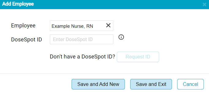 - Note - Unlike in the Add Physician flyout if an employee already has a DoseSpot ID it will not auto-populate the DoseSpot ID field as DoseSpot does not support this function. The user adding the Employee linkage will need to manually enter the employee's existing DoseSpot ID into the field. Then tap Save and Exit to complete the linkage.