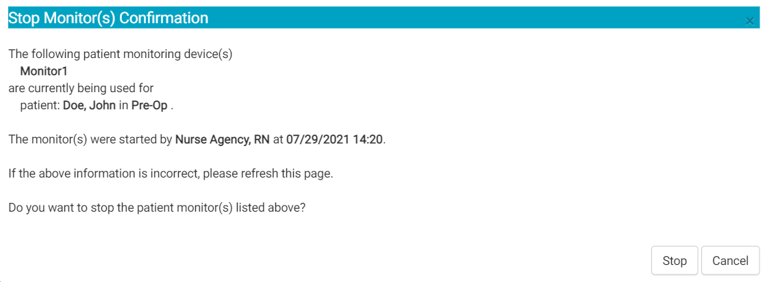 • If an edit icon is present in the "Stop Monitor" column, tapping the icon will open a confirmation flyout where the user can stop the monitor from recording data to a patient chart. The flyout displays the name and location of the patient whose chart is currently collecting the data. The flyout also displays the monitor name, the user who started the monitor, and the time at which the monitor started recording data. To stop the monitor, tap the Stop button in the flyout.