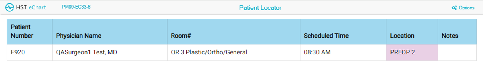 The Center can also elect to include the physician’s name, the scheduled procedure room, the scheduled time, and notes. Notes are updated from the Patient Locator.